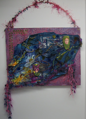 This one has a lot of beads and pages that I rolled up while they were wet and let dry. It could be hung on the wall or place on an easel for display. I gessoed the back of this one but I left a lot of the printed material in the catalog show through the glazes...The green pearlized leaves are some pins that are like corsage pins that I got from Lisa at Collage Stuff. I just pushed the pins into the back of some of the rolled up pages. There is a little frame that was made by cutting a small square in the paper before it was dry. There is a piece of lace that I put on diagonally to create a little more texture and then the beads are from a store called World Bazar in San Jose.